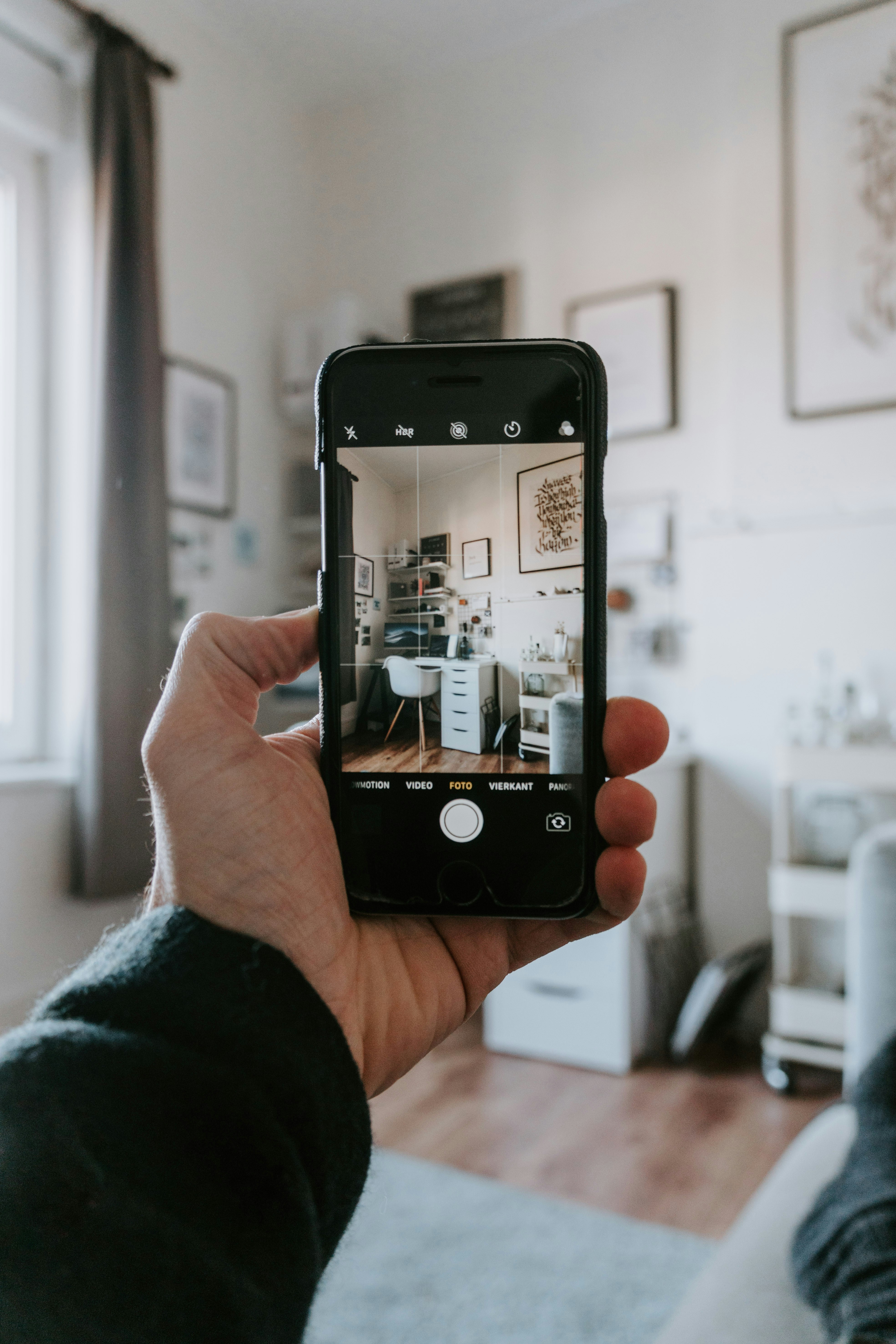 Person at desk cataloging collectibles on MacBook, smartphone nearby showing digital gallery preview, warm home office lighting, cozy collector's space